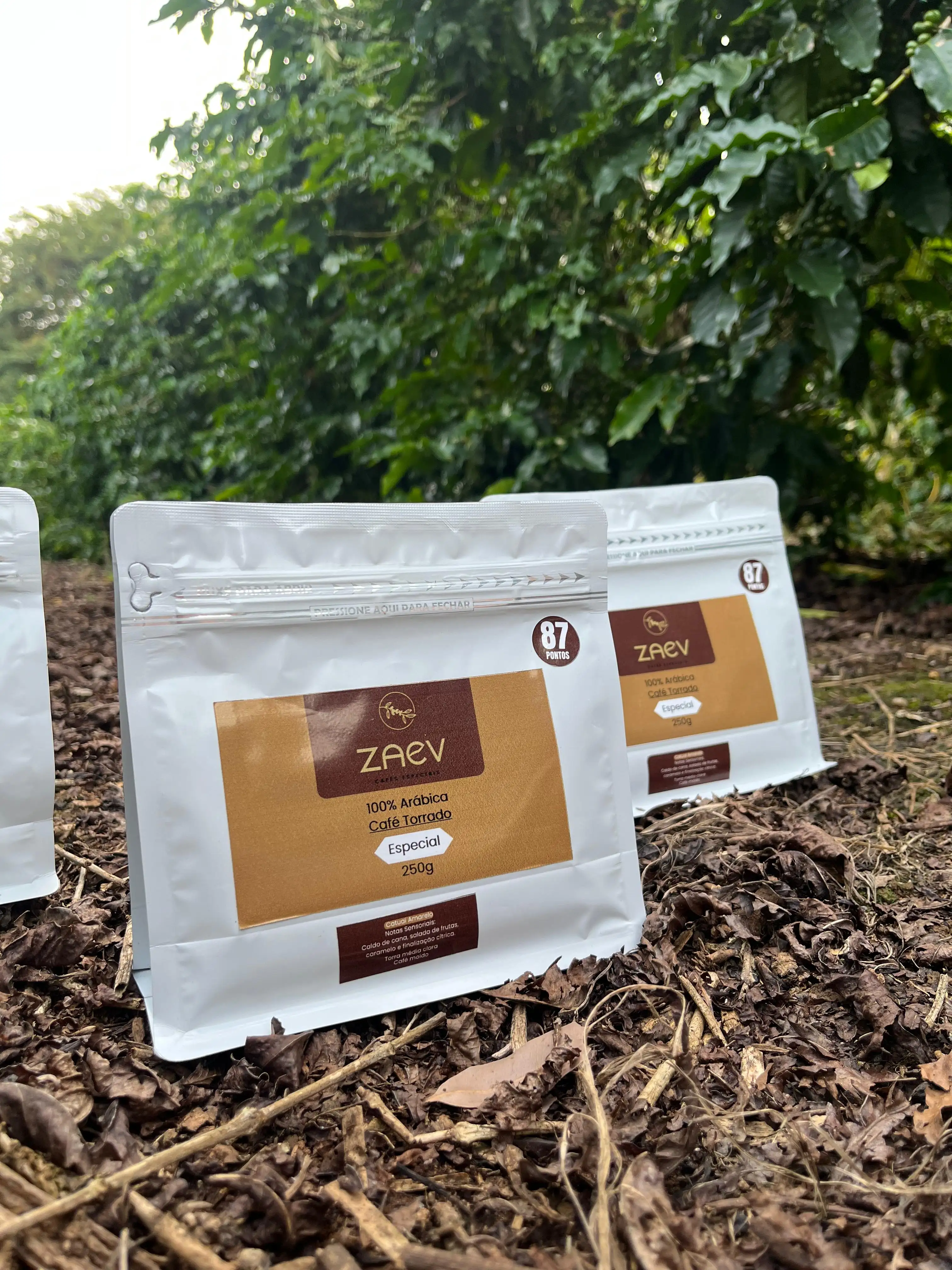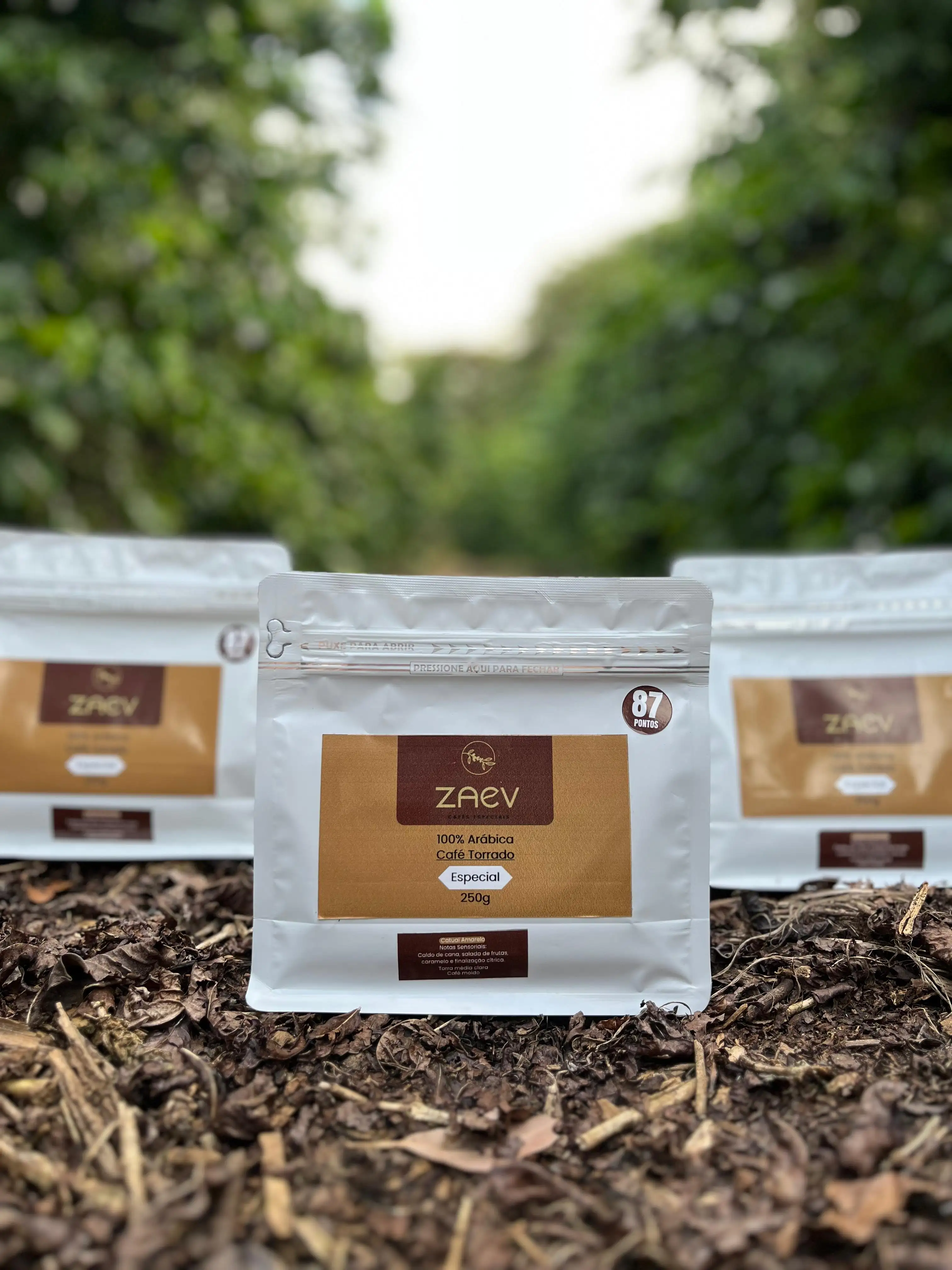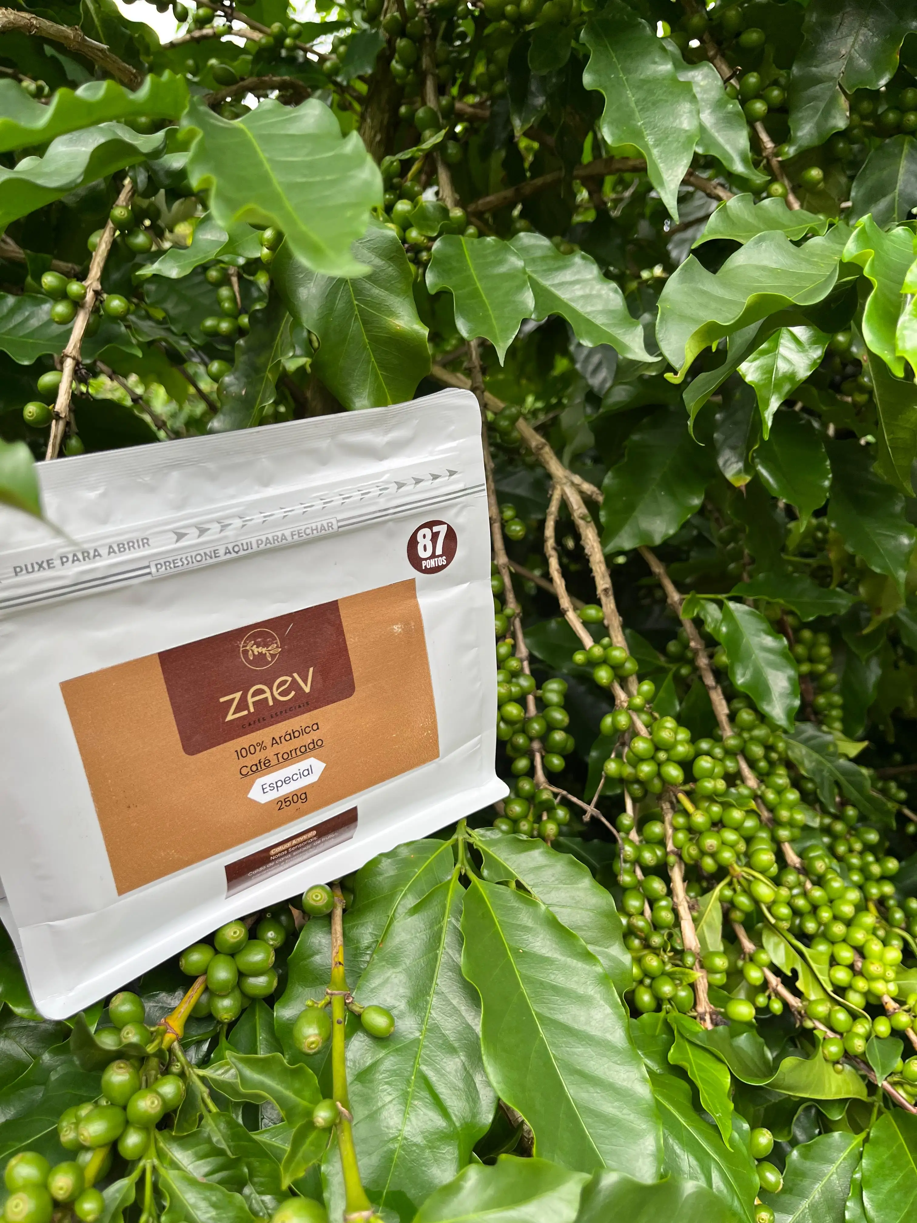 Café Especial da variedade Catuaí Amarelo de 87 pontos, com as notas sensoriais: caldo de cana, salada de frutas, caramelo e finalização cítrica